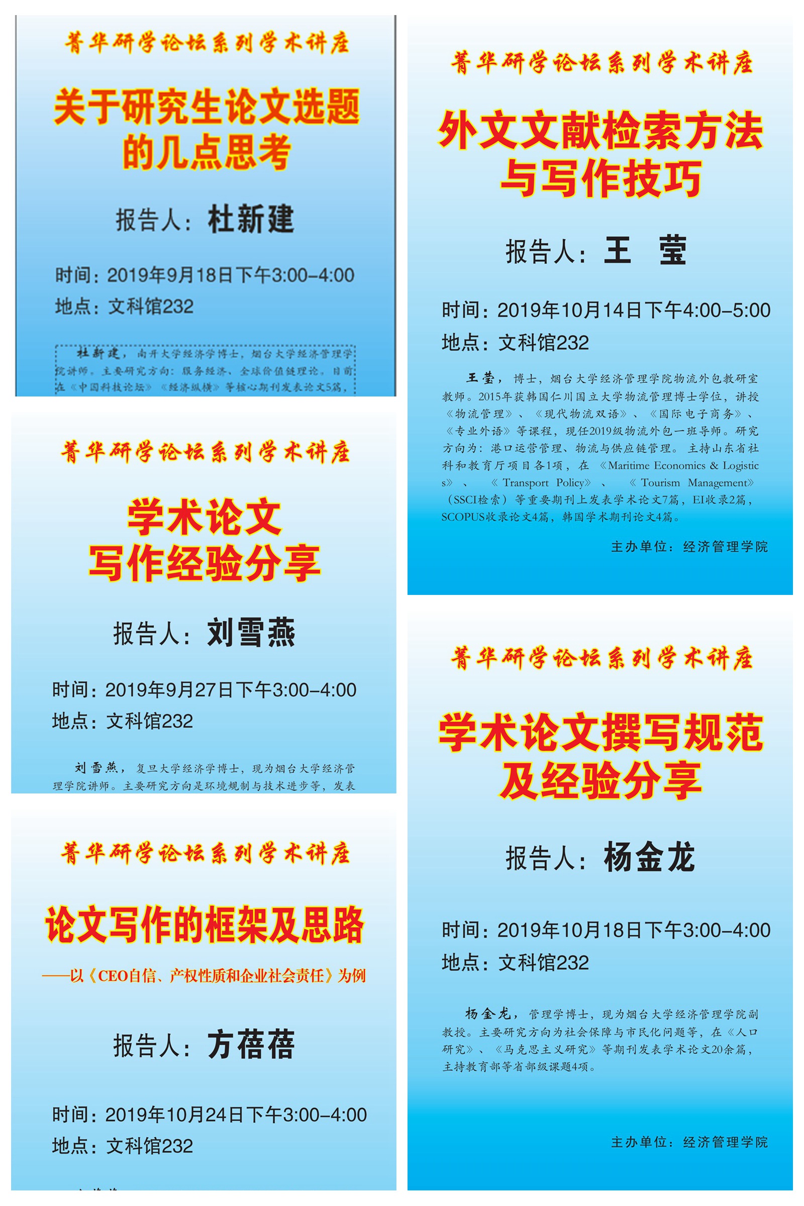 2019年9-10月,值此yl6809永利集团建校35周年之际,yl6809永利集团研究生菁华研学论坛成功举办。论坛是在yl6809永利集团研究生处领导下,经管学院结合经管特色,提高创新能力为目的而召开的。杜新建博士、刘雪燕博士、王莹博士、杨金龙博士和研究生方蓓蓓分别进行了主旨报告。论坛以学术讲座、论文交流和研讨为主要形式,主讲报告人PPT陈述自身的学术经验。现场老师和学生可向报告人进行学术提问,就本学科及相关领域学术论文写作相关问题,进行深入、广泛、自由的学术交流。