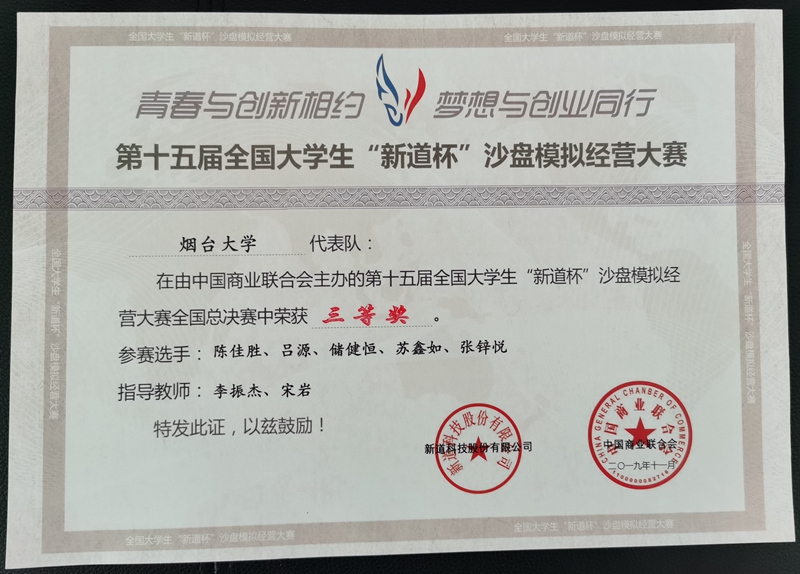 11月16-17日,第十五届全国大学生“新道杯”沙盘模拟经营大赛全国总决赛在南京举行,来自南开大学等全国30个省市的120所高校近800名师生参加了总决赛,我校代表队经过一天的紧张与激烈的角逐,最终荣获三等奖,此次总决赛包括吉林大学,南开大学,西南政法大学等来自全国各省市的120所高校参赛。yl6809永利集团代表队以山东省赛第一名的身份晋级全国总决赛,在总决赛中,运用所学的专业知识,团结协作,奋力拼搏,体现了选手们精湛的工商管理技能,优秀的团队意识,极强的组织沟通能力。