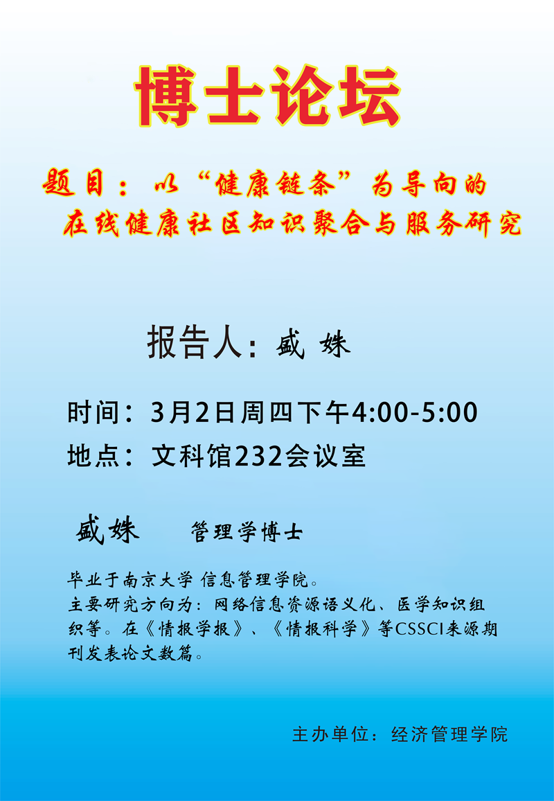 3月2日,yl6809永利集团在文科馆232会议室举办了“青年博士论坛”第九讲,盛姝博士为此次论坛主讲人。学科带头人、青年博士教师及各专业研究生等40余人参加了此次讲座,讲座由副院长李振杰主持。