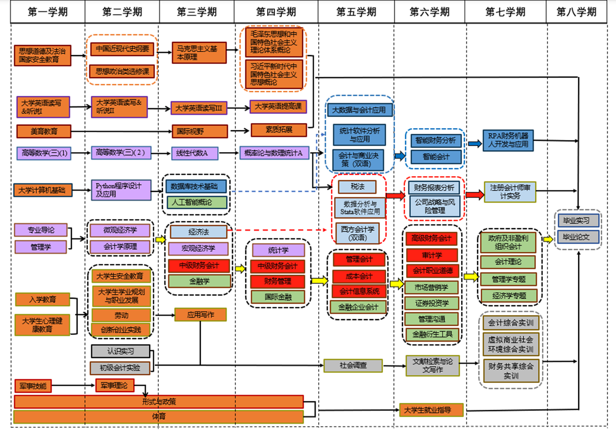 注:橙色表示通识课,紫色表示专业基础课,红色表示专业核心课,深蓝和浅蓝表示专业方向课,绿色表示选修课,灰色表示实践课。