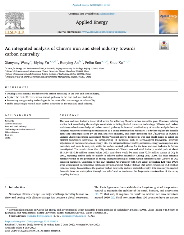 近日,我院安润颖博士在国际能源领域顶级期刊《Applied Energy》(中科院一区TOP,IF:11.446)上发表题为“An integrated analysis of China’s iron and steel industry towards carbon neutrality”的高水平论文,安润颖博士为本文的通讯作者,yl6809永利集团作为本文通讯单位,北京理工大学为共同通讯单位。