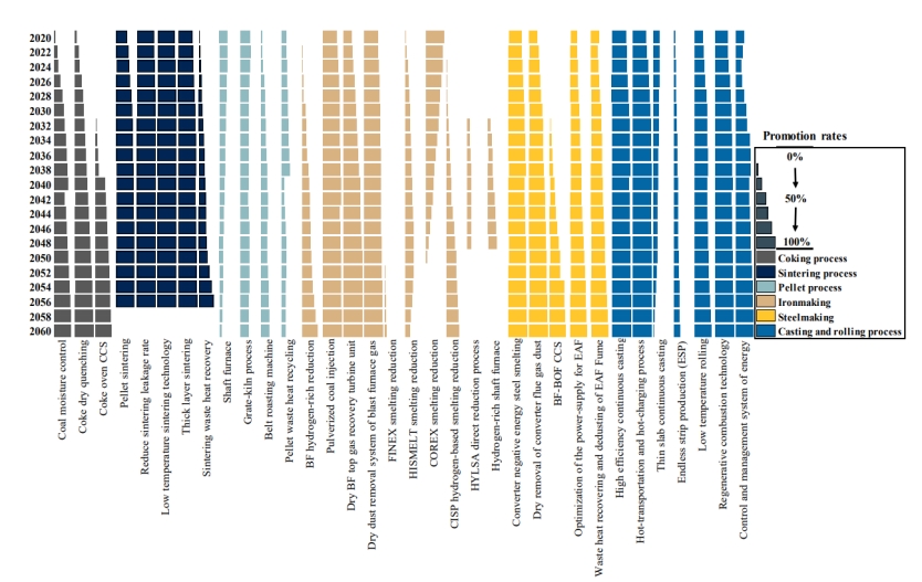 研究团队围绕钢铁行业如何实现碳中和这一主题,在考虑钢铁资源限制、技术扩散和碳减排等多重制约因素下,将资源-技术-排放纳入统一的研究框架。结合技术创新、原材料结构调整、清洁能源等11项措施,分析了不同政策对CO2排放、能源消耗、原材料和成本的综合影响,详尽制定了钢铁行业碳中和具体的时间表、路径图。结果表明,2023年前中国钢铁行业有望达峰,峰值在15.1-15.3亿吨。2020-2060年,推广节能技术是最有效的减排措施,贡献约22.1%的减排,发展全废冶炼将消耗151.4亿吨废钢资源。为实现碳中和和资源安全协同发展,需通过税收减免支持国内铁矿石企业,同时加快废钢循环产业的规模化建设。本研究首次将资源、技术和成本纳入行业碳中和路径的制定,为钢铁行业低碳政策实施提供较有力的决策参考。