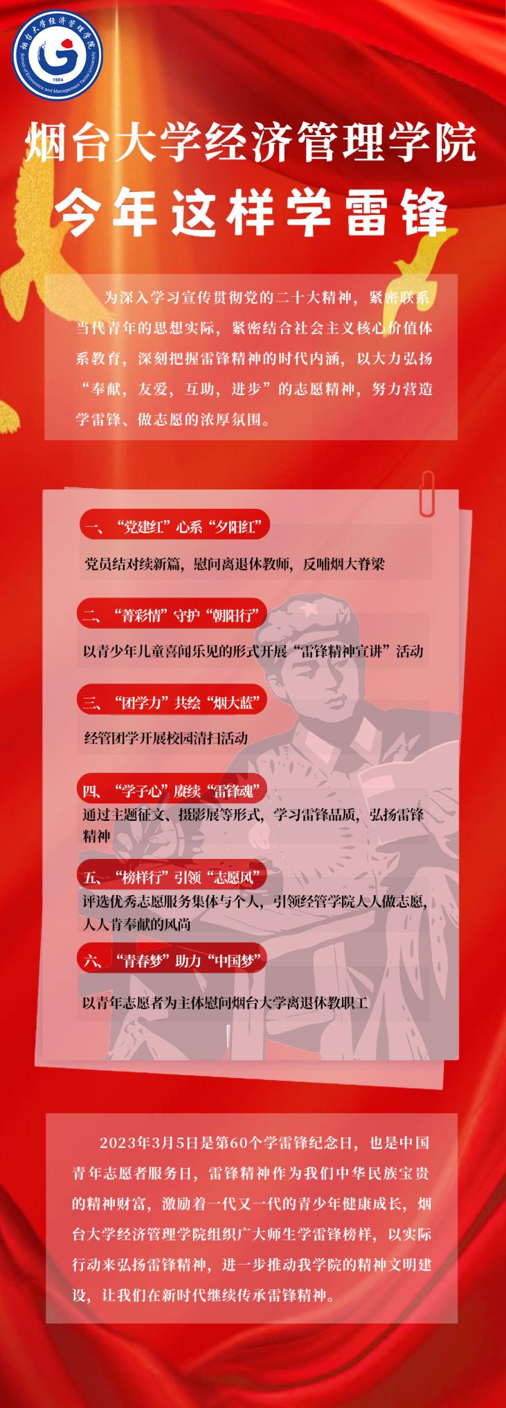 据学院党总支副书记徐道立介绍,为深入开展学习雷锋主题活动,深刻把握雷锋精神时代内涵,经管学院将以“学雷锋榜样、弘时代精神”为主题,组建六支青年志愿者代表团队,分别围绕“党建红”心系“夕阳红”、“菁彩情”守护“朝阳行”、“团学力”共绘“烟大蓝”、“学子心”赓续“雷锋魂”、“榜样行”引领“志愿风”、“青春梦”助力“中国梦”开展六个系列的主题学习活动。穿越历史,雷锋精神永垂不朽,面向未来,经管青年正在行动!