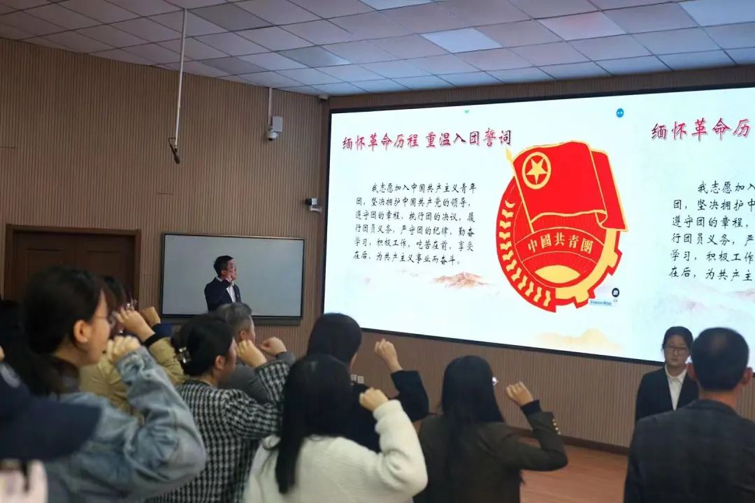 不忘初心方得始终。团员们高举右手郑重宣读入团誓词,铿锵有力的誓词回荡在每位团员的耳畔,提醒着每一位团员铭记团员使命、不忘入团初心。最后,全体人员齐唱团歌《光荣啊,中国共青团!》,提醒青年要坚定听党话、跟党走的理想信念,勇担青春使命,勇做新时代的奋进者。