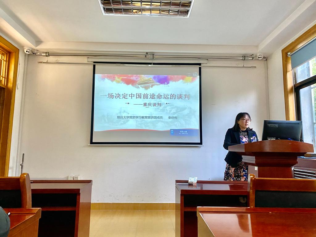 秦晓梅老师围绕着重庆谈判的背景、过程和历史意义,对这一历史事件进行详细介绍和讲解,老师们跟随秦老师的报告,深度领会中国共产党建立的复杂过程和伟大意义,学习共产党领袖高瞻远瞩、运筹帷幄,以勇毅睿智的决断部署领航定向的崇高思想境界和浩然革命正气。随后,秦晓梅老师带领大家学习了习近平总书记在重庆考察工作时发表的重要讲话,尤其是称“重庆谈判”是一场决定中国前途命运的谈判,进一步强调了其在党史中的重要地位。